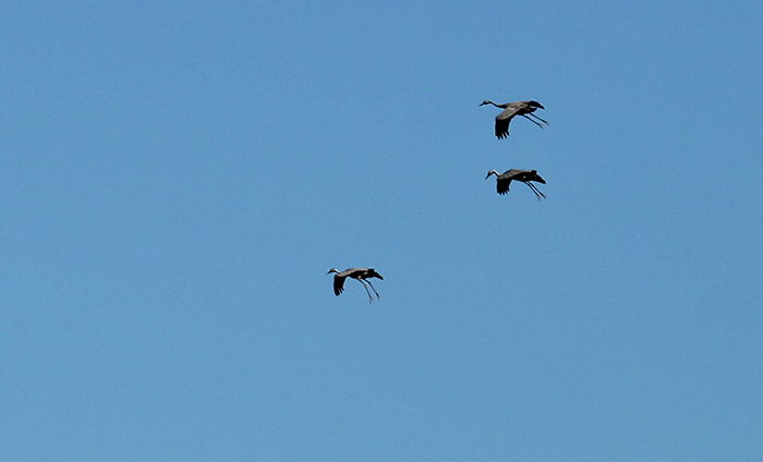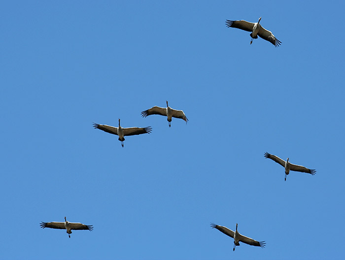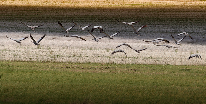 Kraniche auf und über den abgeernteten Feldern: