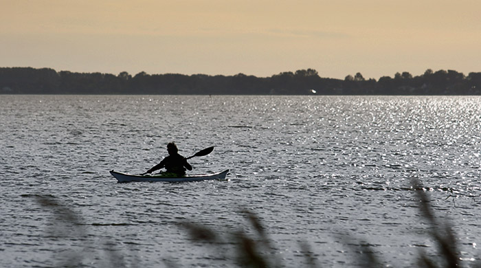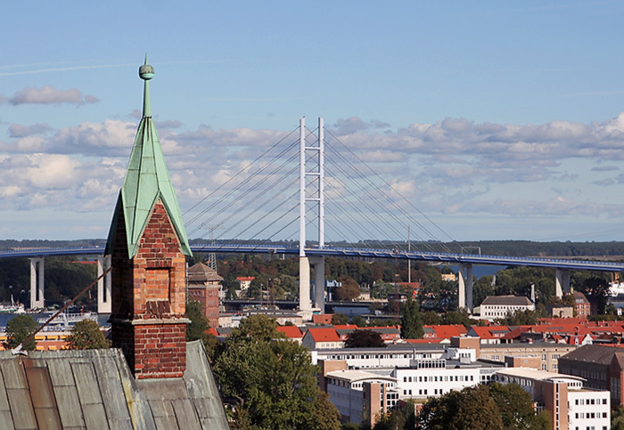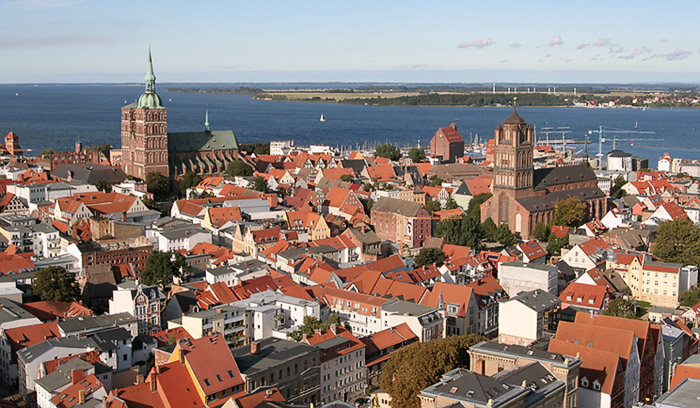 Stralsund - St.-Nikolai-Kirche in der Altstadt, im Hintergrund die Insel Rügen: