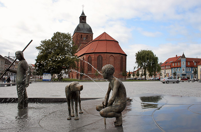 Ribnitz - Marktplatz mit Bernsteinbrunnen und St.-Marien-Kirche: